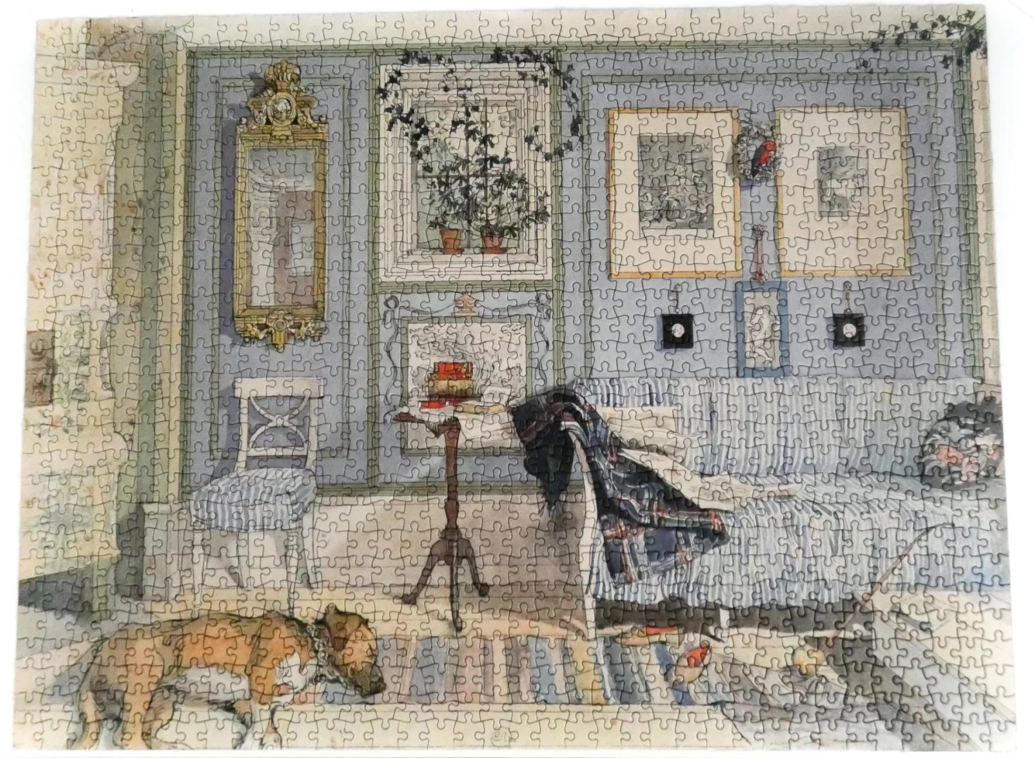 Beyond the blankets and books, Merlin’s owner must of drifted off too and got up in a hurry as his pipe and slippers can be seen scattered across the floor! This humble home has a stunning collection of art on the wall which makes it an idyllic image to piece together.