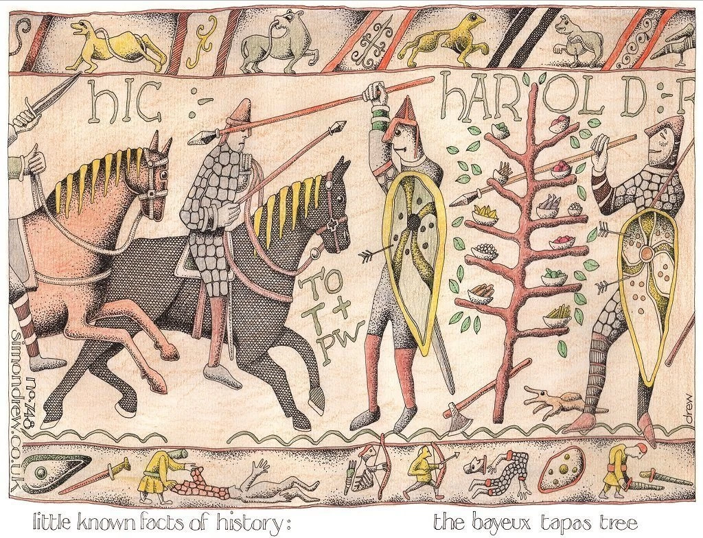 A very funny take on the Bayeux Tapestry! The Bayeux Tapestry is an embroidered cloth nearly 70 metres long which depicts the events leading up to the Norman conquest of England. A very similar feel, except we see an actual ‘tapas’ tree within this design, with various bowls of nibbles balanced within the leaves!