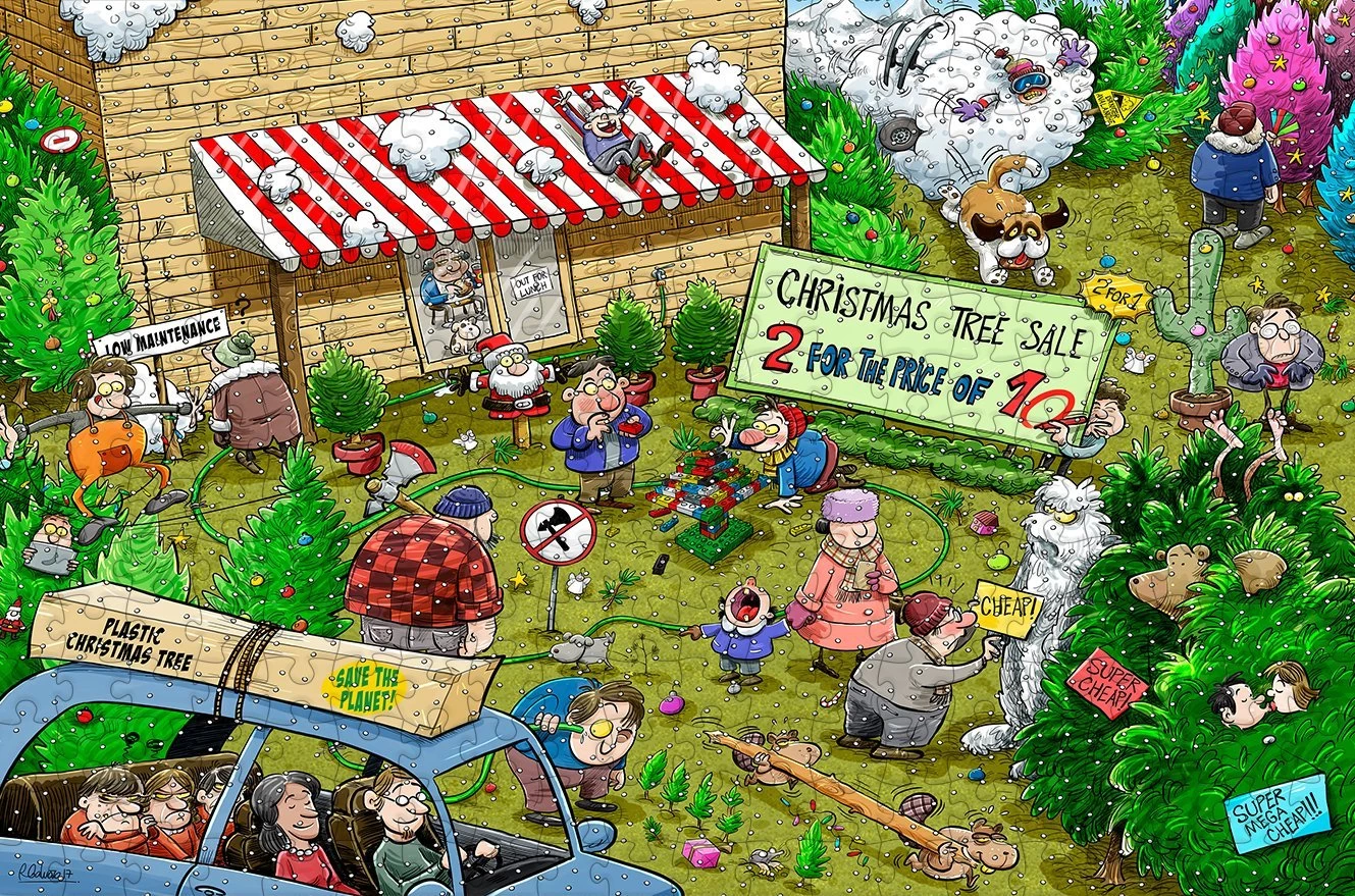 A skier‚ in a giant snowball‚ is careering‚ towards‚ the centre of the yard, while a terrified St Bernard tries to flee the scene. One couple are very pleased with their eco-friendly plastic tree, much to the kids’ disappointment. The beavers have stolen a tree trunk to take home to their dam and a yeti seems to have been confused for a snow-covered Christmas tree. It also seems you can now get 2 Christmas trees for the price of 10,‚ which probably isn’t the type of offer the shoppers were looking for.‚Â