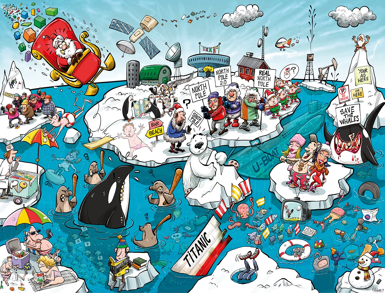The North Pole seems to have become a bit of a hot spot for tourists, who are sunning themselves in the arctic!? It looks like this could be a scene in the future, if global warming accelerates! A group of explorers are arguing over the actual location of the North pole, with one who’s a little confused, thinking he is at the South Pole. Meanwhile, a long line of penguins has shown up and are looking at their map to see if they have arrived in the right place, but it looks like they are looking for the South Pole too! Father Christmas is making his way to the North Pole, but it’s so overcrowded that it looks like he’s about to crash land in the middle of it all! The elves are wondering where Santa has got to and have failed to spot him flying towards them! An ice-cream seller, the remains of the titanic, an angry bunch of seals and a hungry killer whale can also be spotted in this crazy scene.