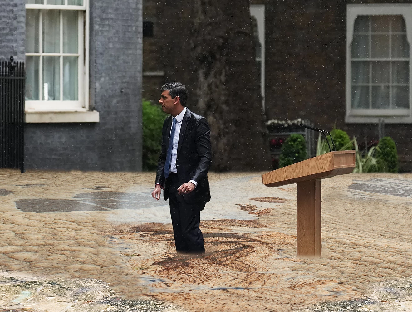 Rishi Sunak at the centre stage of his soggy career, wading around outside No.10.