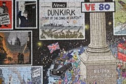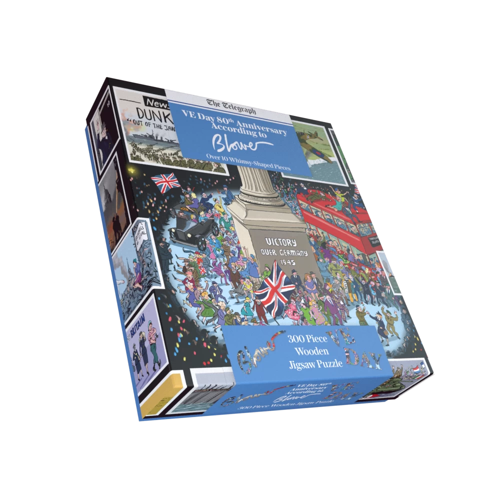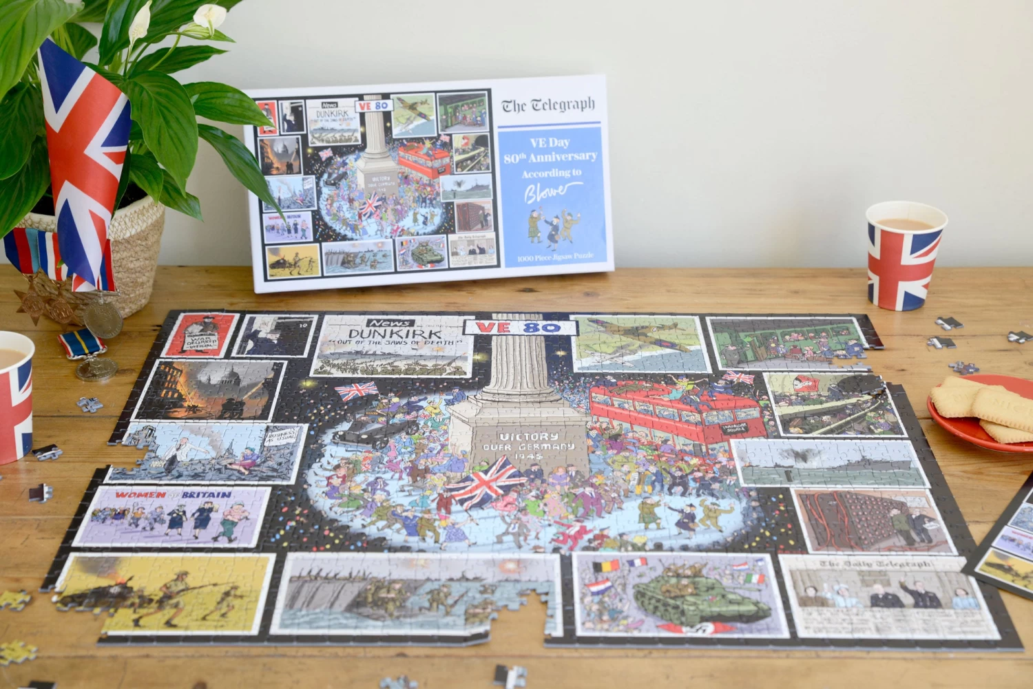 Depicting scenes of troops, tanks, fighter jets and warships in battle, alongside iconic headlines, leaders and the women who kept calm and carried on, this puzzle captures the spirit of VE Day.