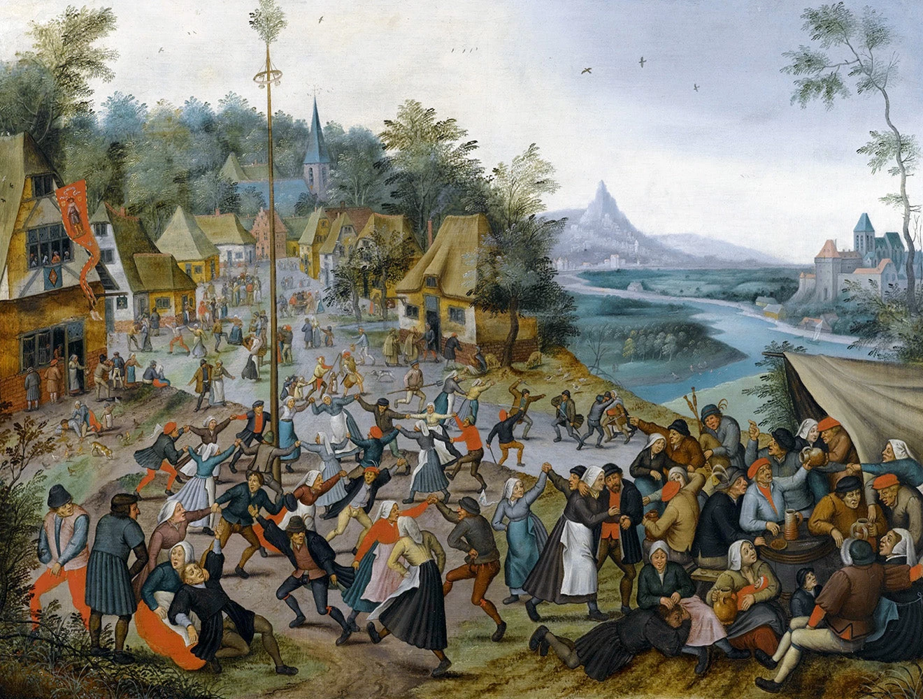 As with Pieter Brueghel the Younger’s work, you need to look a little closer to see what is really going on! In this seemingly pleasant scene, we can see a large group of people dancing around the maypole and having a merry old time. But look a little closer, and you will find some interesting things going on, such as a sword fight, a man being a bit ill, and a lot of seemingly drunk people!
