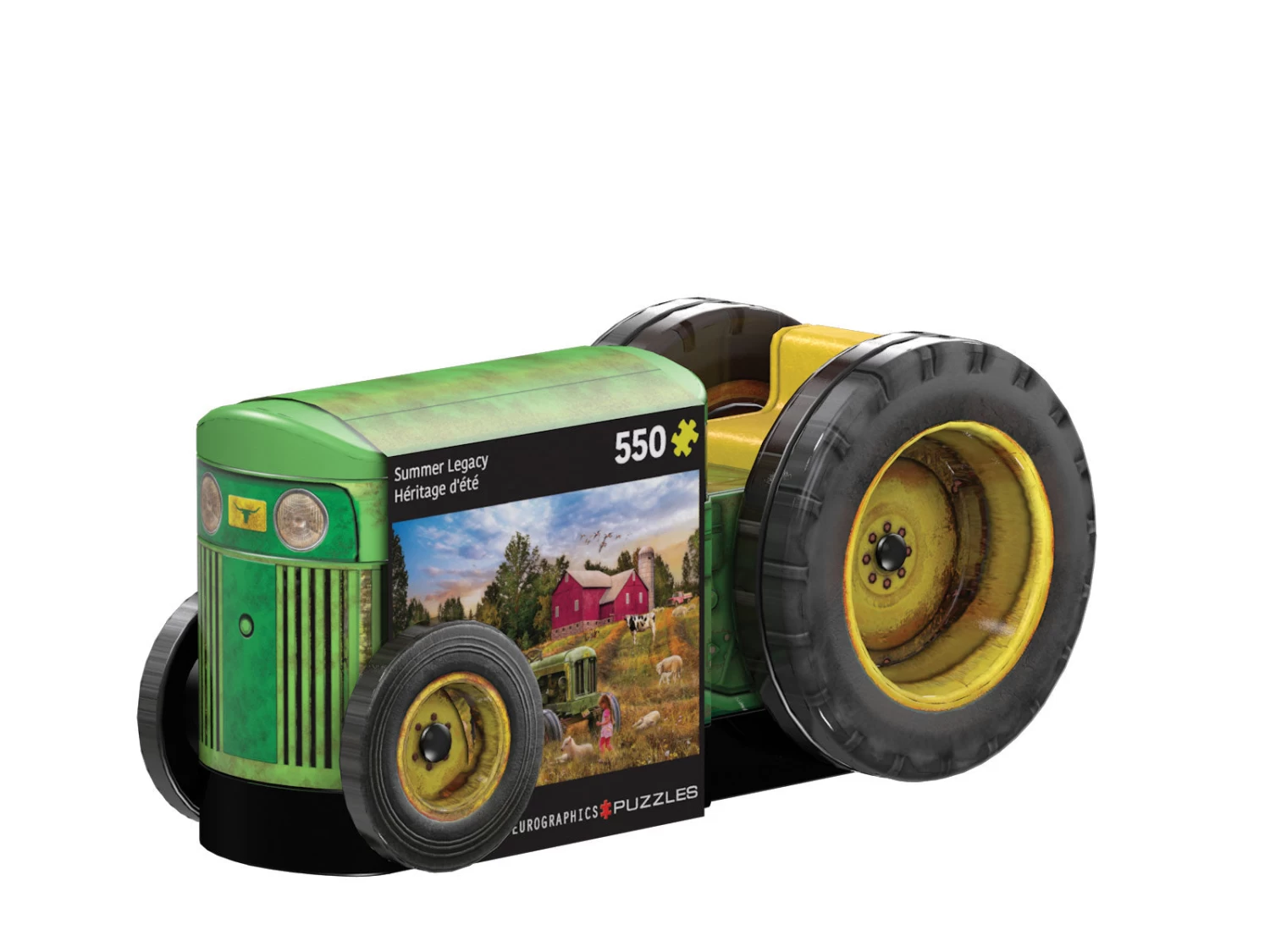 A vintage green shaped tractor tin with puzzle and poster. Across rural farmlands, a well recognized image. Puzzle is a nostalgic landscape farm scene.