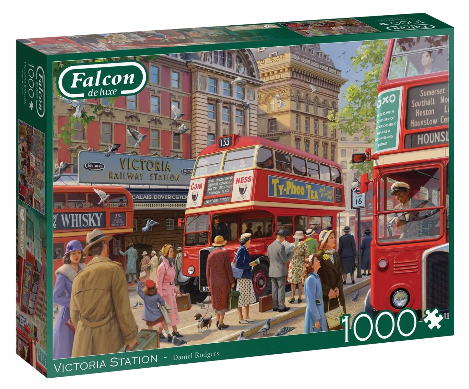 Take a trip to London with the Falcon de luxe Victoria Station 1000 Piece Jigsaw Puzzle! Step back in time as you piece together this 1000 piece jigsaw, featuring classic red buses and the bustling Victoria Station. Perfect for puzzle lovers and travel enthusiasts alike.