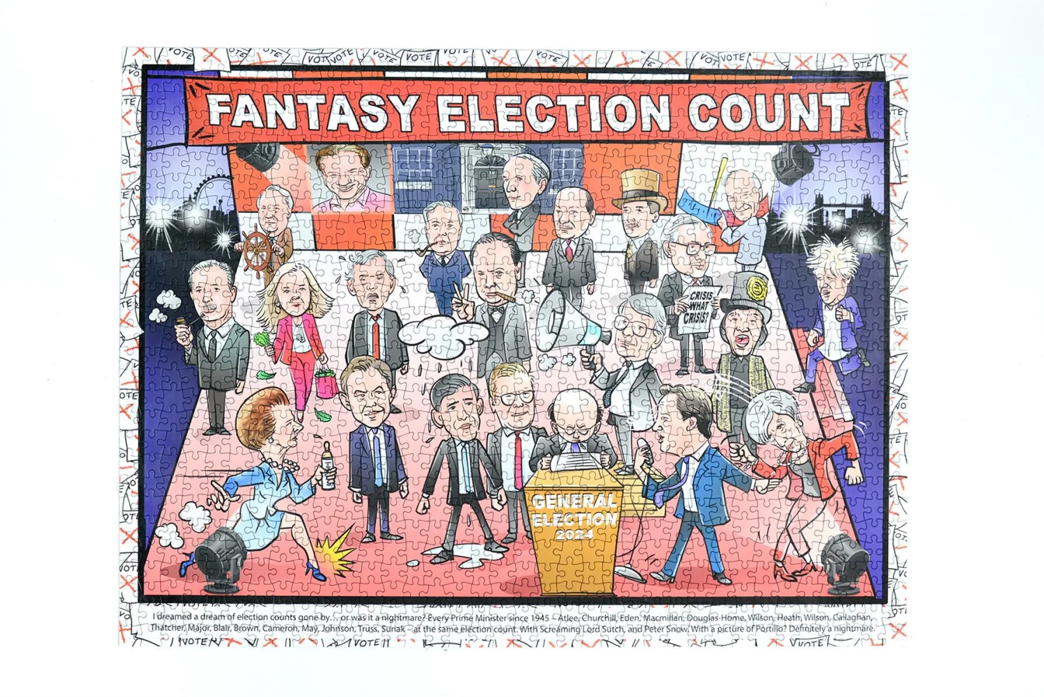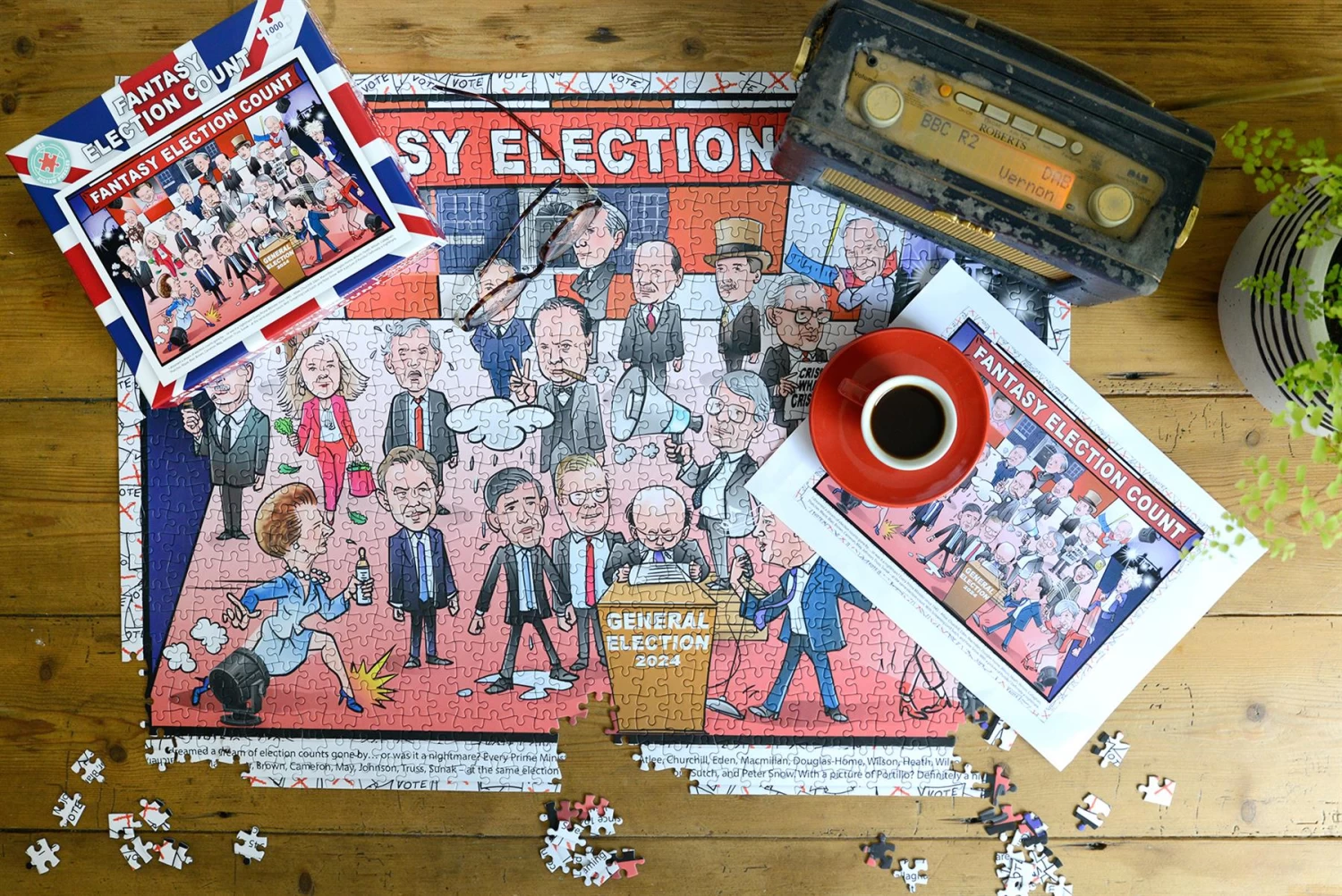 As the General Election is nearly upon us, we thought we’d bring some fun to political puzzling. This hilarious cartoon ‘Fantasy Election Night’ features all the UK’s prime ministers since 1945 at the same election count. It’s a chaotic scene which finds a dishevelled Boris Johnson running late, Margaret Thatcher snatching milk and John Major with his megaphone. Great leaders of the past – and some not so great – join Screaming Lord Sutch for the ultimate electoral showdown!