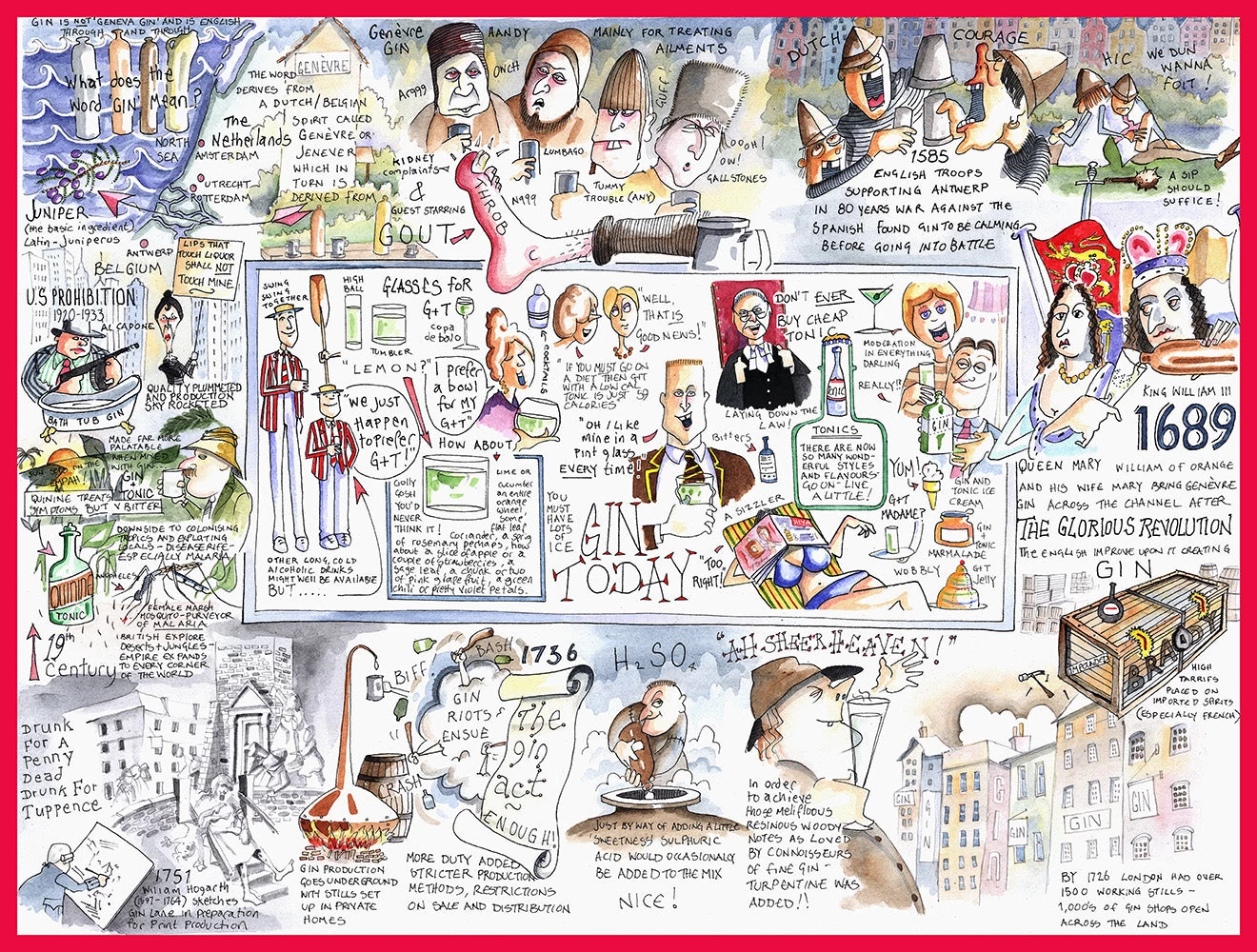 Indulge in a Gin infused jigsaw puzzle! This brilliant illustration from Tim Bulmer tells us all about Gin, where it came from and how it has adapted over the years.