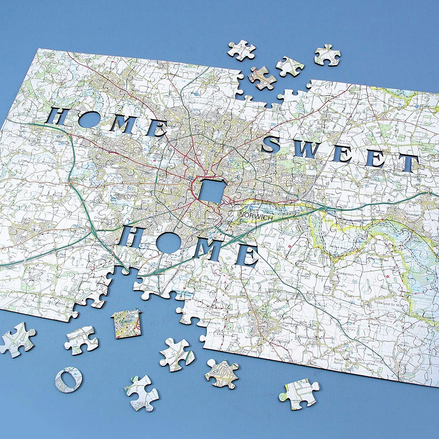 This unique, made to order 300-piece map puzzle is centred on a place of your choice. Simply provide your address and postcode and we will create your individually handcrafted jigsaw puzzle, using 2mm wood. Each jigsaw contains the message ‘Home Sweet Home’ made from a number of novelty shaped pieces or “whimsies”, so called because Victorian Craftsmen – who invented the jigsaw concept during the 19th century – cut unusually shaped pieces “on a whim”.