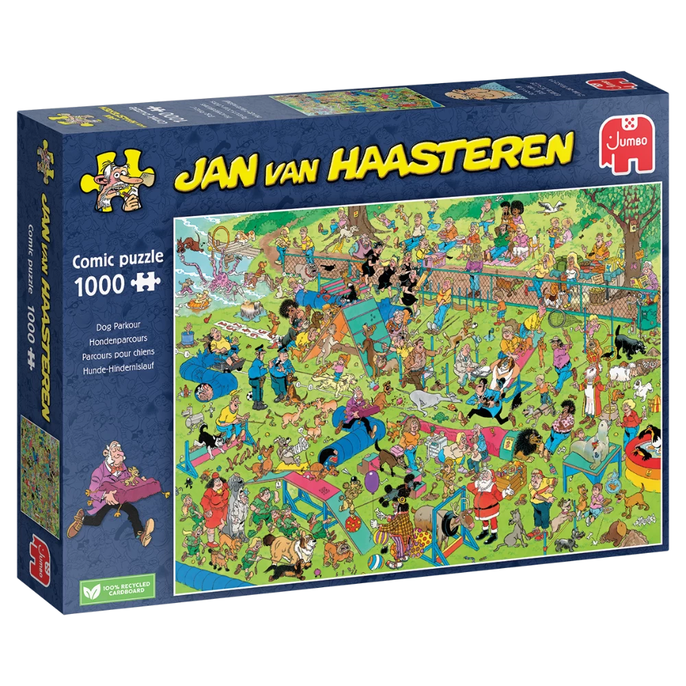 Dive right into this chaotic scene, full of energetic dogs and comical characters as they compete in Jan Van Haasteren’s Dog Parkour 1000 Piece Jigsaw Puzzle!