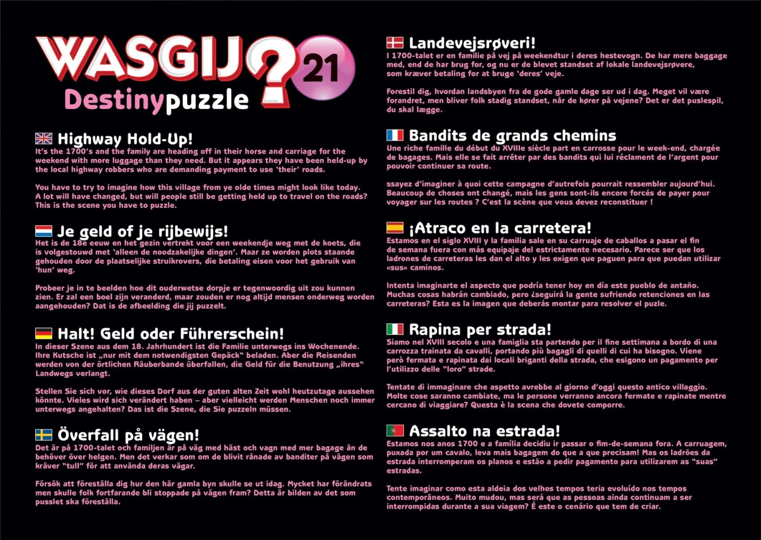 Wasgij Destiny is the unique time-travelling puzzle concept where you have to use your imagination and the clue provided to piece together what the image printed on the box will look like in the modern day.