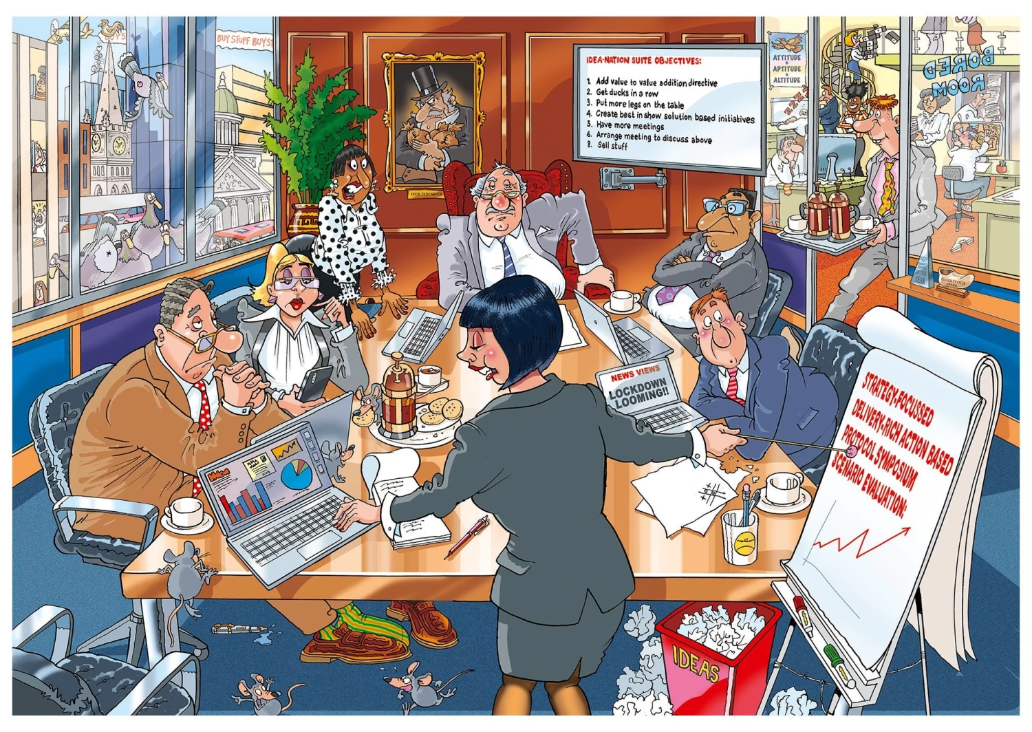 Use your imagination to work out what the future of this business meeting will be – will it still be in an office, or somewhere completely different? In the scene on the box, everybody is listening intently to the person running the meeting- we wonder what chaos will ensue in the future!