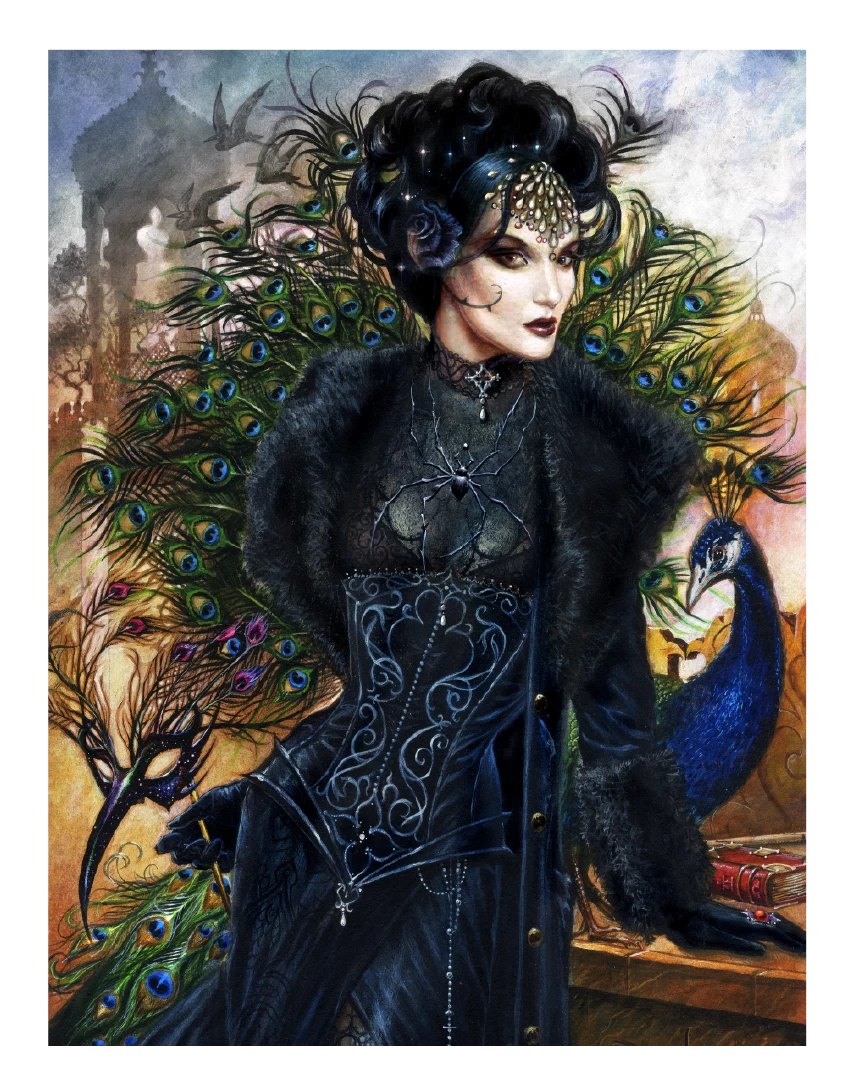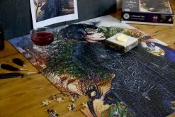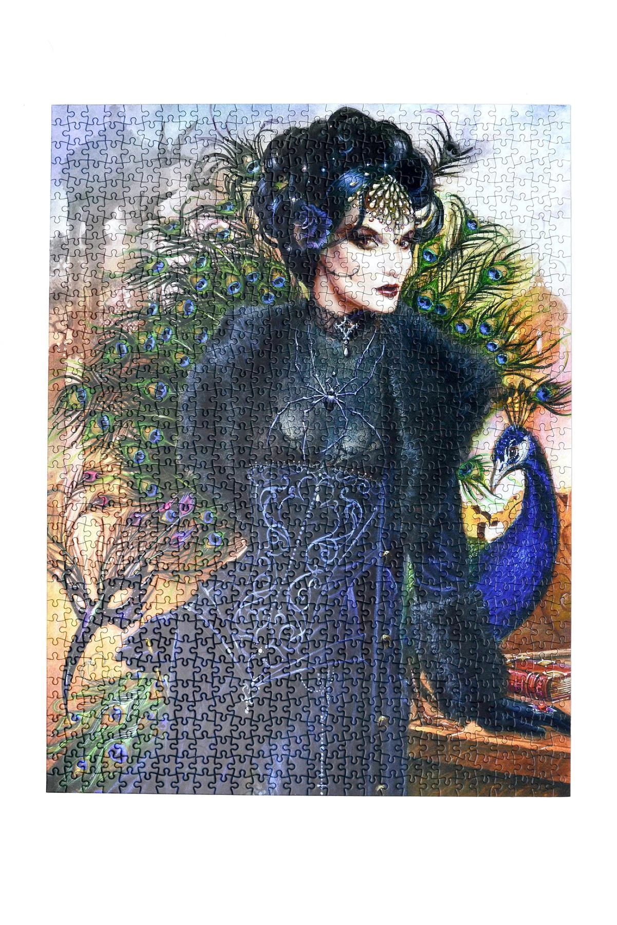 A deliciously dark puzzle to make your friends envious of your puzzling table. Discover the magical world of Alchemy as you puzzle the spectacular stare of Le Mauvais Oeil, guarding her precious peacock. Dressed in a beautiful black bodice and dressed to impress it is hard to look away from this enchanting puzzle. Fantasy lovers will love piecing this puzzle together as they enter another world of fantasy and own a piece of Avalon in your home.