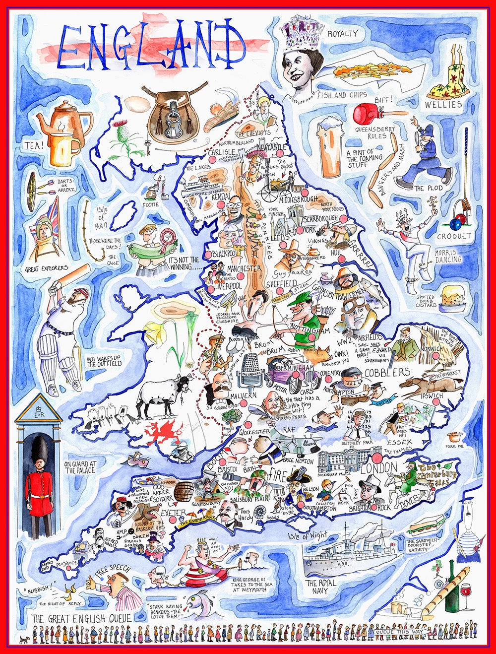 In this very funny jigsaw puzzle design, you will find so many drawings that truly depict everything that is so typical of English culture (in a humorous way of course!). The map clearly shows cities from around the country, but also includes sketches the suit that area, such as a pirate in Cornwall and Robin Hood in Nottingham! Around the map, you will find typical English quirks, such as a Morris dancer, fish and chips, a pot of tea and of course, the great English queue!
