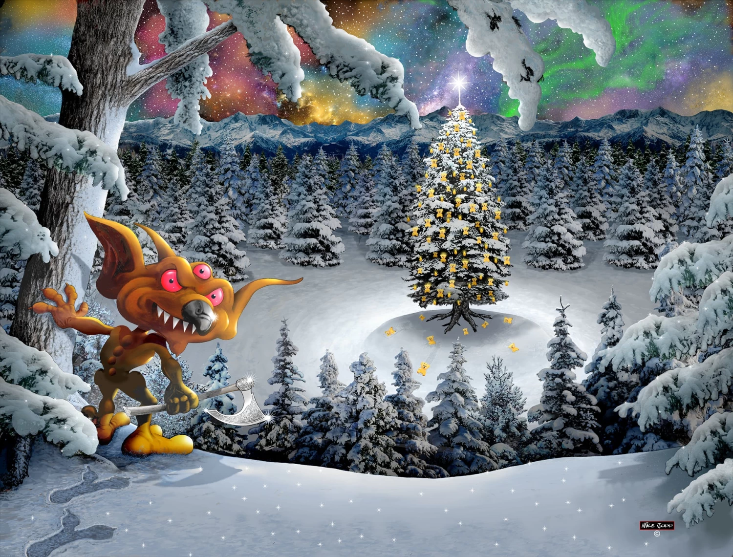 However, standing at the top of the hill before the tree, is Grymnitt the Ghastly – an evil rock-troll armed with the axe of Odin. He looks menacingly over his shoulder as he plots to cut down the Teddy Bear Tree and steal the shining silver pinecone. Will Father Christmas save the day?