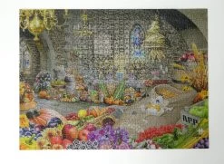 Originally called Harvest Feastival this delightful scene has been remastered and renamed Nipperling as intended. Part of the Wormberry Jam collection, by Mike Jupp. This fun 1000 piece jigsaw puzzle features Nipperling Mouse who’s fast asleep after stealing a big meal and is unaware of impending fate. This church scene is a classic display of your local harvest festival. The tables are full of fresh produce from this years crop, ready to share with the local community and the mouse is dreaming of his next delicious treat! From pickled onions to pumpkins this colourful puzzle will keep you well entertained with all of the tasty treats and vibrant flowers on display.