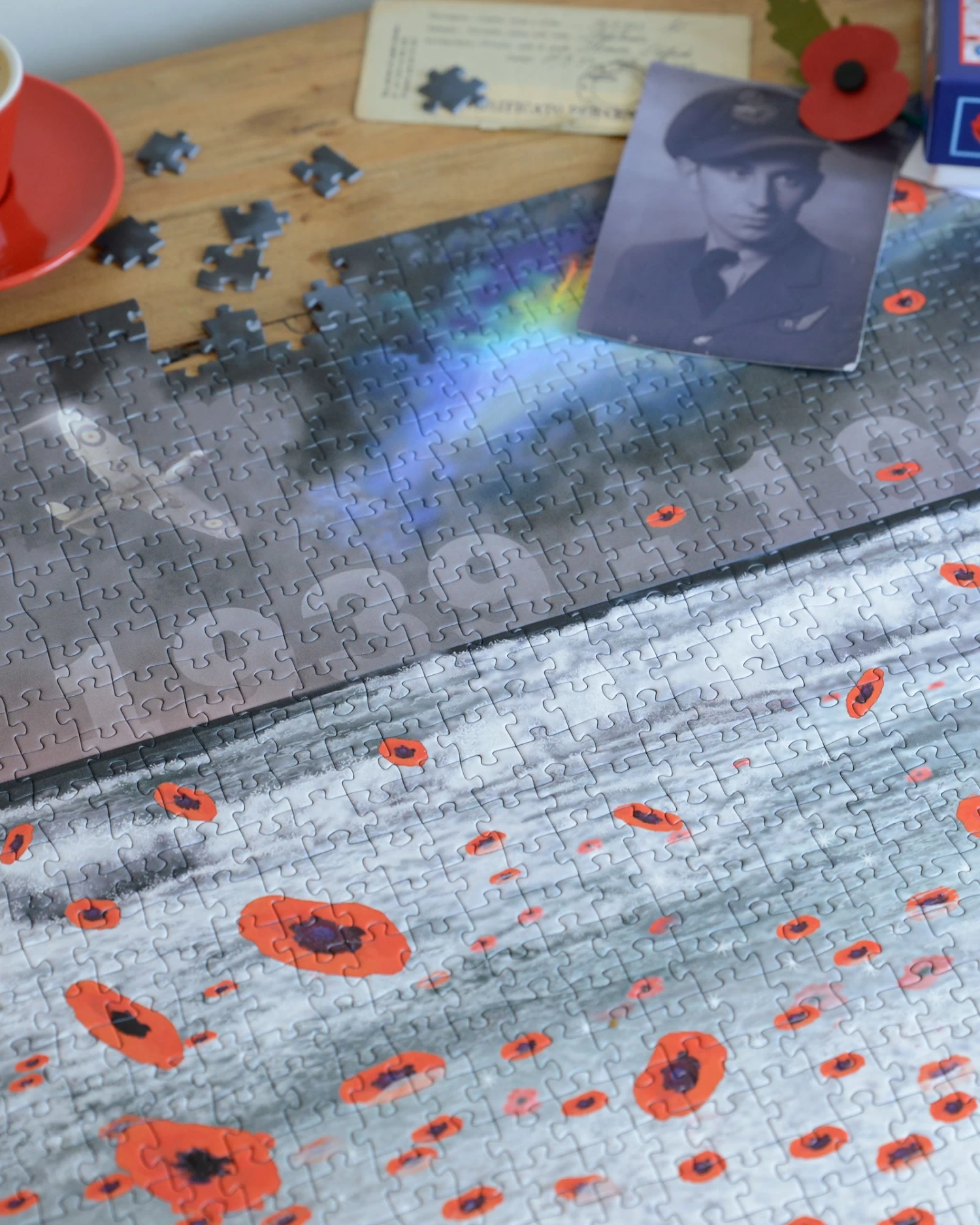 This poignant puzzle features a stormy sky above a turbulent sea, with a WW2 aircraft gliding towards a glimmer of hope – a rainbow. Poppies are falling symbolising all those who lost their lives during the dark days of War. The word ‘Remember’ etched in to the sand, our hearts and memories as a touching tribute for those we have lost. The perfect challenge for War enthusiasts.