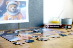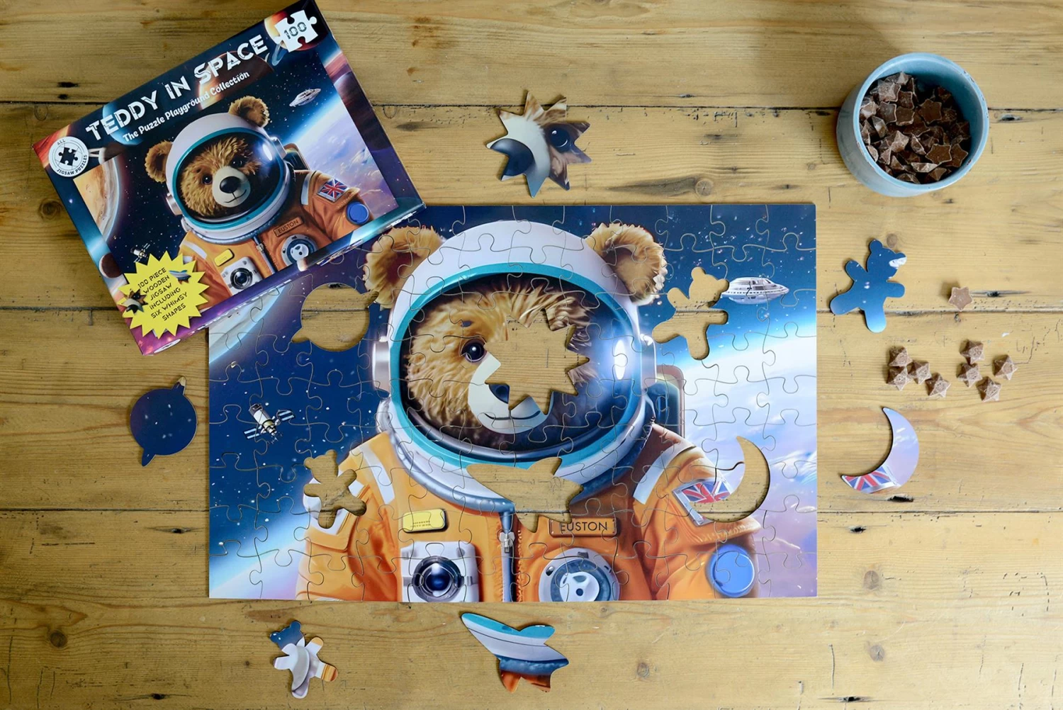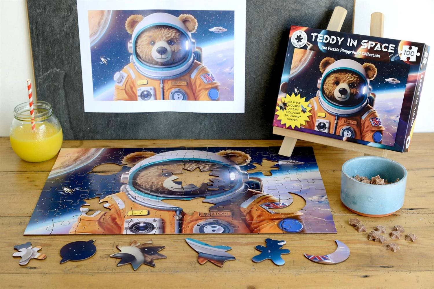 Blast off into fun with this quirky Teddy In Space 100 piece wooden jigsaw puzzle!