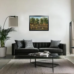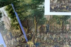 Some people are sitting down enjoying wine and spirits, whilst others are caught up in the crowds that have gathered around the stalls. The longer you spend admiring this artwork, the more you’ll notice the small details in this painting.
