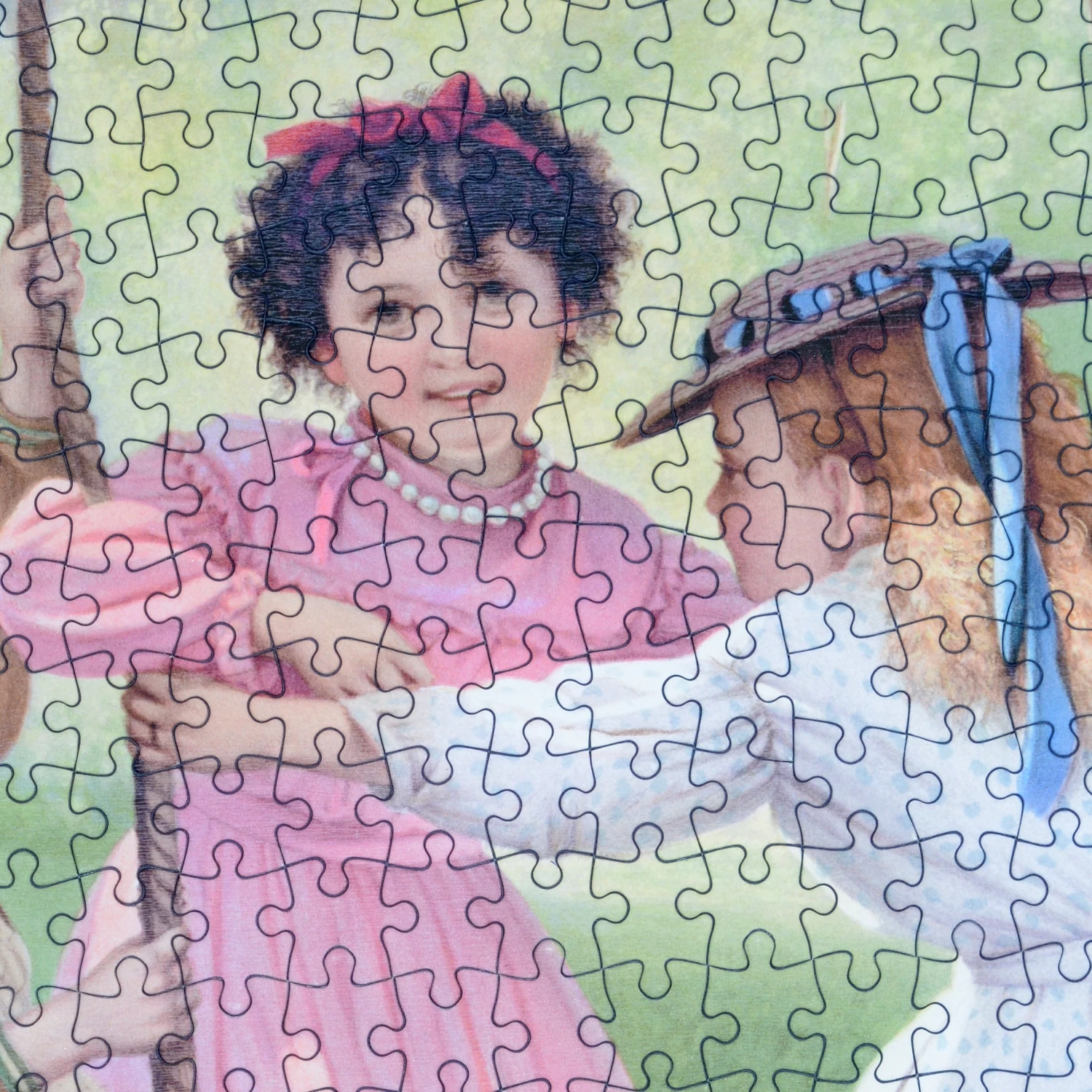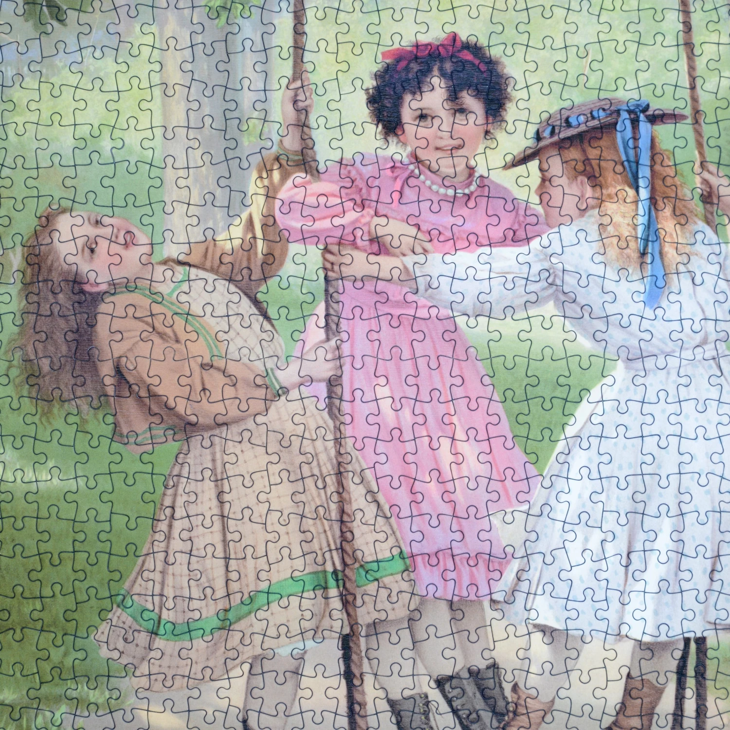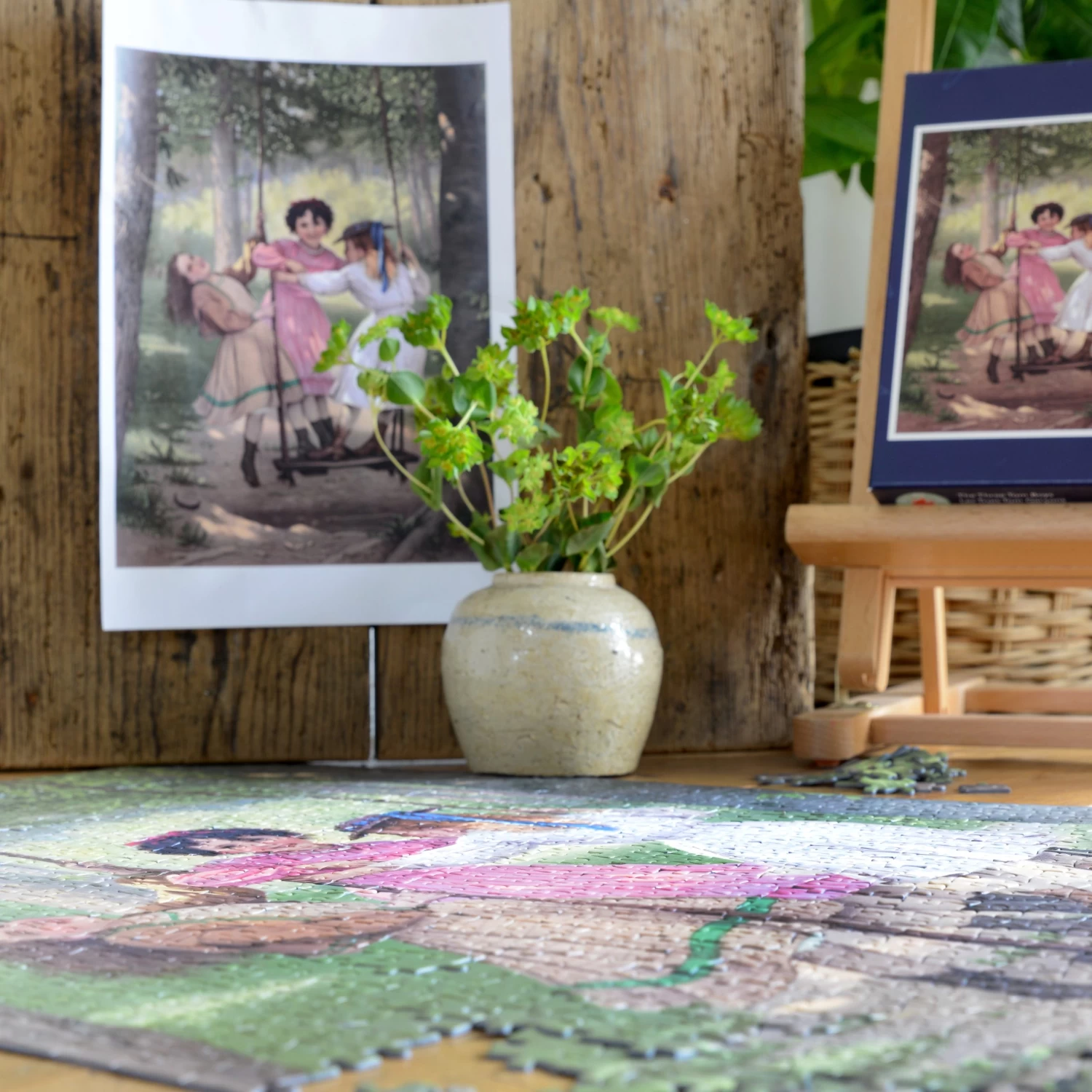 Featuring fine art and a traditional rope swing, this puzzle captures the playful spirit of three girls enjoying a carefree day in the woods. Take from 1800’s this traditional fine art scene makes us feel what it is to you be young and enjoy the simpler things in life. Dressed in their finest dresses and robust boots these children are having great fun! A delightful scene to piece together full of friendship and joy.