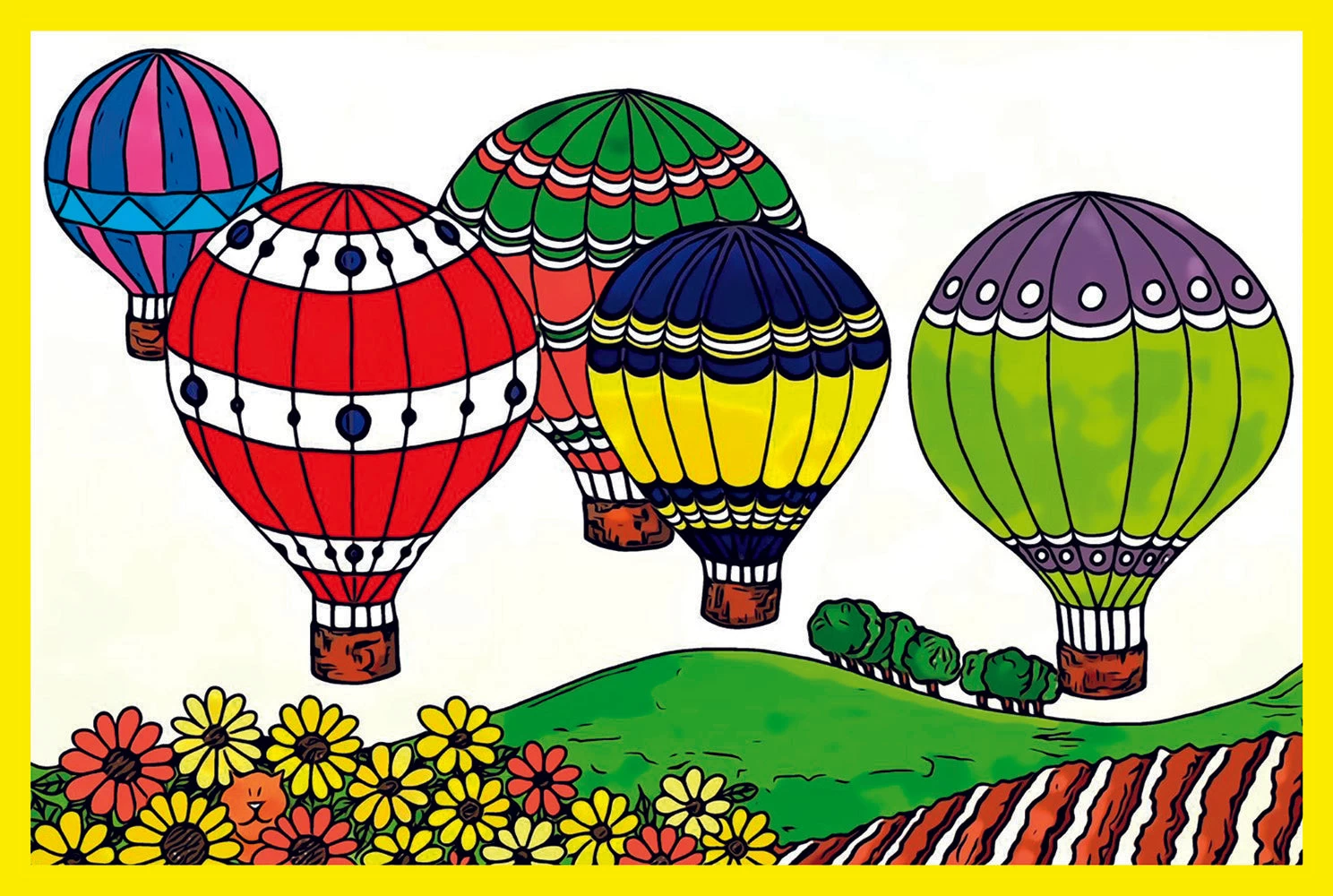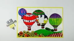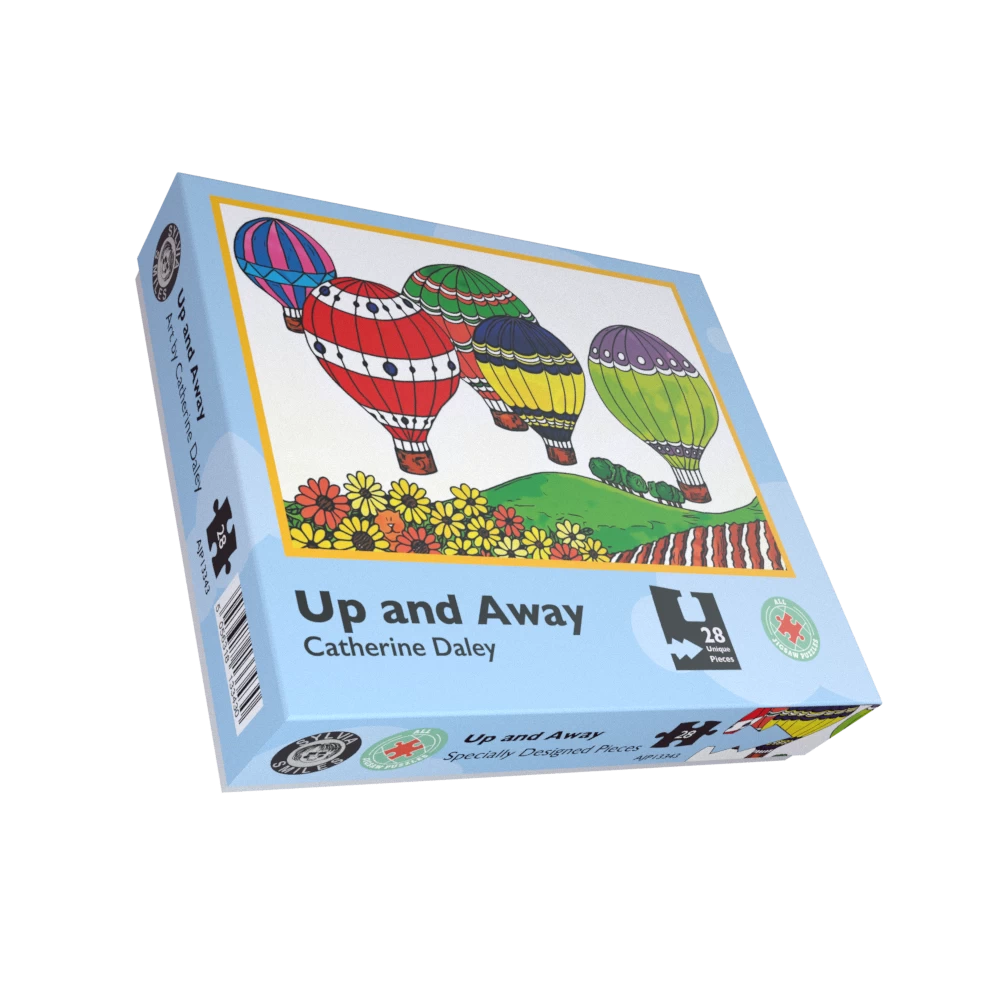 Each 10cm puzzle piece has a distinctive shape, allowing the picture to be constructed without sight. The colourful illustration of four hot air balloons, flying above a rolling field and flowerbed, fronted by a cheeky ginger cat has been designed for people completing the puzzle with low vision.
