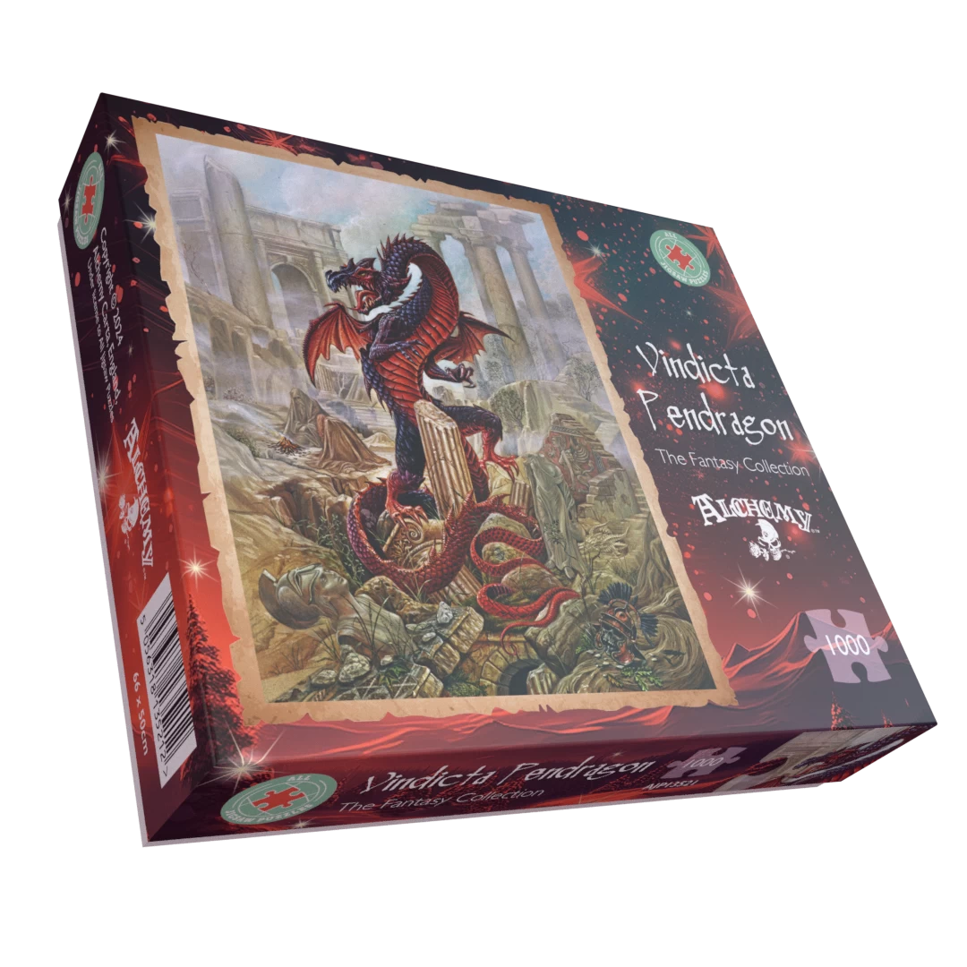 Embark on a whimsical adventure with the Vindicta Pendragon 1000 Piece Jigsaw Puzzle. Piece together a majestic dragon in a mystical ruins setting, evoking a sense of wonder and fantasy. Transport yourself into this magical realm and unleash your inner dragon with this fantasy jigsaw puzzle! Will you order this puzzle and slay the dragon?
